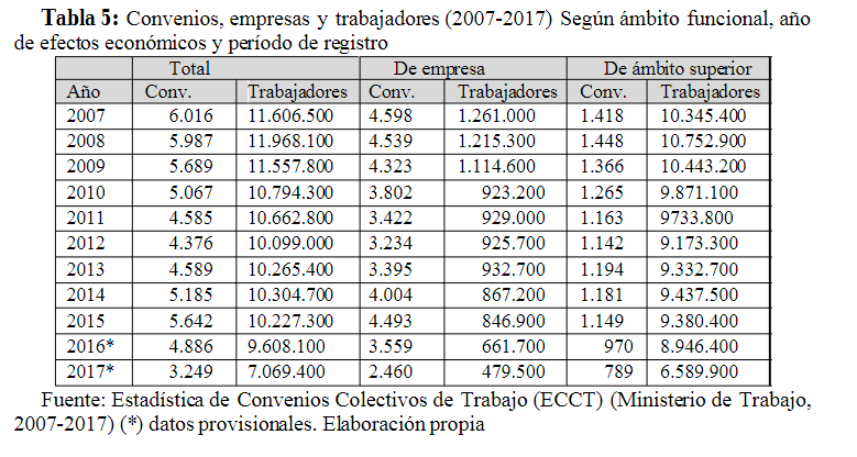 Ministerio de Trabajo (2007-2017) Estadística de Convenios Colectivos de Trabajo (ECCT), en: http://www.mitramiss.gob.es/estadisticas/cct/welcome.htm [consulta 14/04/2018].