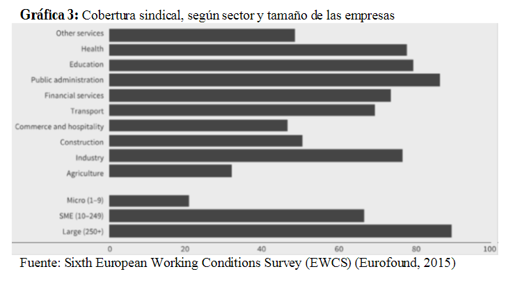 Fuente: Sixth European Working Conditions Survey (EWCS) (Eurofound, 2015)La cobertura de la representación sindical presenta, asimismo, pautas diferenciadas por sectores de actividad y tamaño de las empresas (gráfica 3), siendo considerablemente mayor en las grandes empresas, los servicios públicos y la industria manufacturera que en las microempresas, la construcción y los servicios privados.