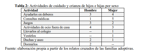 Fuente: elaboración propia a partir de los relatos cruzados de las familias adoptivas.Son muchas las actividades destinadas al cuidado y crianza de los hijos e hijas que se comparten en pareja. En los relatos, pasear, jugar o leer, son actividades que se hacen conjunta o indistintamente por el padre o por la madre. Siguen compartiendo los momentos familiares como los paseos, excursiones y vacaciones, con independencia de la edad de los hijos e hijas. La Tabla 2 destaca aquellos casos en que padres o madres practican actividades exclusivas sin la presencia de su pareja. Independientemente de que exista un reparto en las labores de cuidado, la distribución es más equitativa que en el caso de las tareas del hogar.