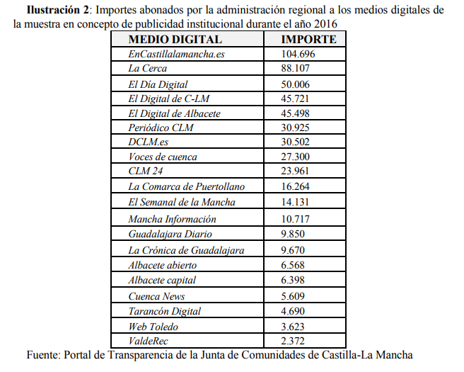 Se trata de la primera iniciativa para establecer criterios mínimos transparentes en la distribución de las campañas, si bien no aplica una valoración cualitativa a los solicitantes, cuestión que sí recoge la mayoría de convocatorias autonómicas en otras comunidades cuando hablamos de ayudas públicas a medios de comunicación (Galletero y López Cepeda, 2018). Siguiendo los criterios aprobados, durante 2016 recibieron contratos publicitarios 32 medios digitales de la región, por un montante total de 708.749 euros.