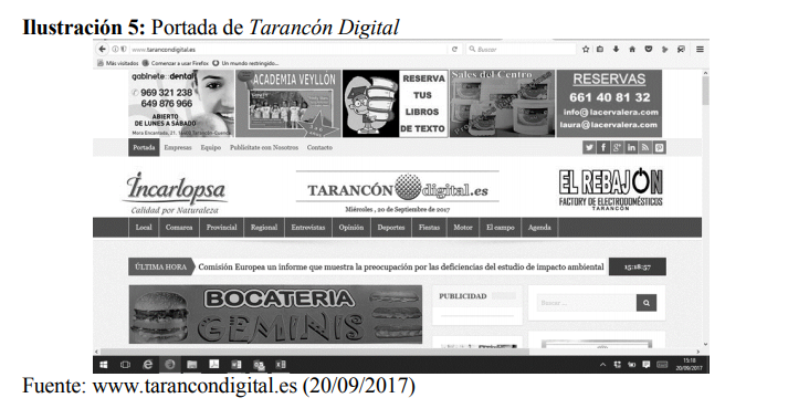 Fuente: www.tarancondigital.es (20/09/2017)En el análisis de la muestra, además de una tendencia a la desorganización en la colocación de elementos en la interfaz, se han localizado secciones vacías en El Día digital (‘Nosotros’) y en Web Toledo algunas secciones temáticas que en apariencia son del medio (España, Religión...) remiten a páginas externas (El Mundo, Aciprensa, Diez Minutos, ABC C-LM) o presentan enlaces que no funcionan (‘Farmacias de guardia’). En La comarca de Puertollano las secciones aparecen únicamente en el apartado destinado a Hemeroteca, sin que exista un menú temático.