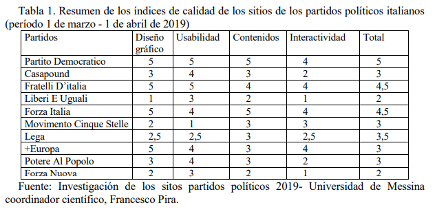 Tabla 1. Resumen de los índices de calidad de los sitios de los partidos políticos italianos (período 1 de marzo - 1 de abril de 2019)