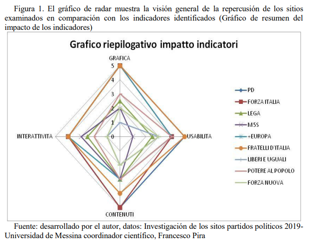 Fuente: desarrollado por el autor, datos: Investigación de los sitos partidos políticos 2019- Universidad de Messina coordinador científico, Francesco PiraA partir del conjunto de datos, surge un aspecto particularmente relevante a los fines de esta disertación: ante los altos parámetros registrados sobre la base de los indicadores identificados, que se pueden encontrar en la figura 1, de partidos como: Partido Demócrata, Forza Italia, el resultado electoral demuestra que las fuerzas políticas que han elegido una estrategia de comunicación de manera personalista, han interceptado a los ciudadanos electores, esto representa una verdadera paradoja y una clara evidencia de que la nueva dinámica social impone la prevalencia de formas de personalización cada vez más extremas, todos centrados en la capacidad de construir procesos de credibilidad distorsionados, que desencadenan dinámicas muy asertivas por parte de la audiencia electoral.