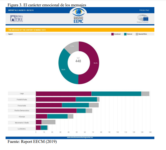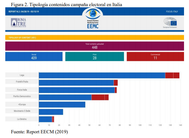 La intersección de la evidencia surgió de la investigación en los sitios web de los partidos y movimientos políticos italianos con las encuestas estadísticas realizadas por EEMC sobre los instrumentos utilizados durante la campaña electoral en los diversos países europeos, nos ha permitido validar las consideraciones derivadas del monitoreo, el papel desempeñado por las redes sociales en todos los países del sur de Europa e Italia en lo particular es evidente, con una connotación específica con respecto a esto último: la preeminencia de los temas de política interna utilizados en una clave europea, la inmigración y la seguridad sobre todo, plagiados para crear un discurso que alimentara el consenso interno y uniera a los ciudadanos en una posición de contraposición hacia las instituciones europeas. Una estrategia particularmente exitosa en Italia con el sorprendente resultado de la Lega, pero que también ve el crecimiento de una política populista a nivel europeo.