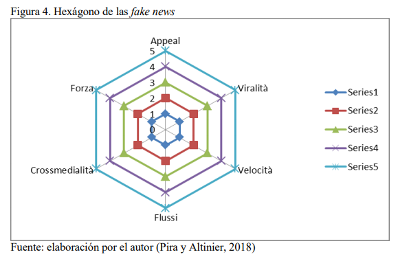 Precisamente la visión propuesta por Innis es útil para recordar en la concatenación entre fuerza y debilidad las dinámicas que caracterizan el flujo de las fake news. En trabajos anteriores se presentó el análisis que condujo a la definición de un conjunto de indicadores llamado hexágono que agrupa 6 características que definen su fuerza y la persistencia en el sistema de medios y que originan información errónea y desinformación.