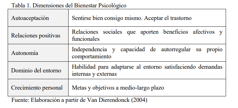 Fuente: Elaboración a partir de Van Dierendonck (2004)El concepto desarrollado en las líneas anteriores permite indagar en la vivencia subjetiva del trastorno por parte del sujeto en lugar de hacer una recopilación de los síntomas que experimenta el mismo, por lo que resulta especialmente adecuado para el propósito del presente estudio. En síntesis se trata de relacionar dinámicas sociales que afectan a los sujetos con trastornos mentales como la discriminación y el apoyo social con el bienestar psicológico de estos.