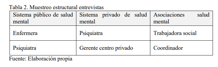 En la primera fase se diferencia entre contexto formal (instituciones relacionadas con la salud mental) e informal (relaciones sociales interpersonales). En el plano formal se estudian los sistemas de salud mental público y privado, así como las asociaciones. Se llevan a cabo seis entrevistas semiestructuradas a sujetos con una amplia trayectoria profesional dentro de dichas organizaciones considerándolos como población especializada, en el sentido de que su conocimiento experto de las dinámicas institucionales permite obtener una información muy relevante para con los objetivos de investigación (Valles, 1997). Para analizar la información producida en esta fase se recurre a la Grounded Theory (Carrero, Soriano y Trinidad, 2012).