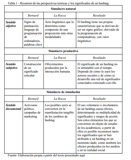 Tabla 1 - Resumen de las perspectivas teóricas y los significados de un hashtag