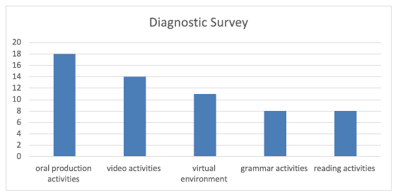 We can see in the graph that students chose oral production activities and video activities as the most preferred for them when learning English. The other choices were not very appealing for them. This is why the activities were designed and implemented considering this diagnosis; the other aspects of language (grammar, vocabulary, reading) were not set completely aside because the contents and sequences of the textbook required them to be included.