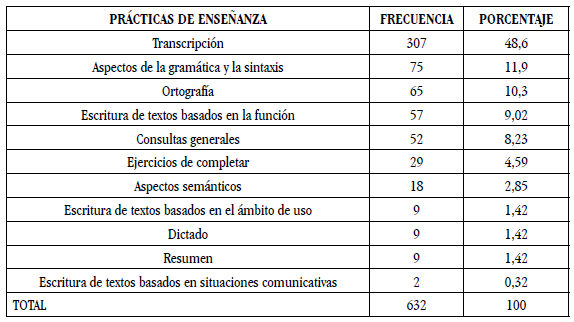 El análisis y la interpretación de la información obtenida reiteran el énfasis dado a los aspectos formales de la estructura de la lengua, la ejercitación normativa y el trabajo centrado en la transcripción de diferentes tipologías textuales. Las principales actividades giran en torno a resolver cuestionarios, realizar consultas, desarrollar ejercicios gramaticales centrados en las reglas ortográficas y la estructura oracional, sin que estos elementos asuman como eje la construcción del sentido y significado de la escritura.
