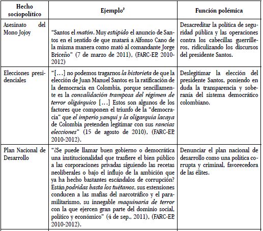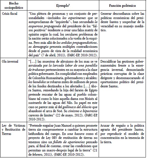 Los enunciados vituperantes en el discurso guerrillero aparecen articulados con un conjunto de situaciones históricas en la vida política del país y de las dinámicas propias del conflicto interno. Entre estos acontecimientos resaltan seis que motivaron una mayor cantidad de enunciados vituperantes: el asesinato del jefe militar de las FARC-EP, alias 'Mono Jojoy'; las elecciones presidenciales de 2010; el Plan Nacional de Desarrollo (PND) del primer Gobierno de Juan Manuel Santos; la crisis fiscal; la ola invernal (fenómeno de La Niña); y la Ley de Víctimas y Restitución de Tierras. En la Tabla 1 se ejemplifica y analiza la relación entre los insultos, sus condiciones sociopolíticas de emergencia y la función polémica que cumplen. Se subraya de nuevo que los ejemplos provistos en la Tabla no constituyen la totalidad del corpus analizado, sino que ilustran la función polémica atribuida y cada uno representa un subconjunto de los enunciados vituperantes asociados con los acontecimientos que los motivaron. En el desarrollo posterior de la Tabla 1 también se introducen otras ejemplificaciones.