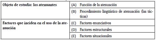 Cada uno de los factores se compone de variables específicas. En el caso de (B) -atenuación, contamos con 21 identificadas, más una de "otros" (para mecanismos no planteados). La sección 2.1 resalta aquellas más relevantes en el corpus.