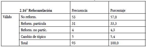 La mayoría de las reformulaciones depende de partículas en posición inicial, a modo de marcadores discursivos que anuncian el cambio de contenido ilocucionario, como en (4) y (5) o contenido informacional (6).