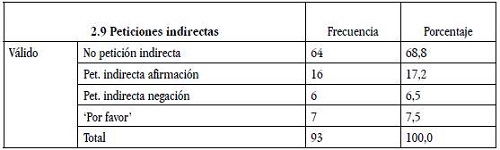 Así, la mayoría de actos de habla directivos se apoya en la indirección, apareciendo como una marca que reitera el énfasis en la cortesía negativa y los parámetros de relación social de la época.