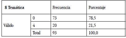 Factor 8: Temática: se añadió un quinto nivel a la variable, sin definición establecida, pero que corresponde a aquellos temas que, en el cariz particular de Confesión a Laura, no son propiamente cotidianos (no en el sentido ofrecido por Grupo Val.Es.Co, 2013), pero tampoco los excluyen. (Ver sección 2.3).