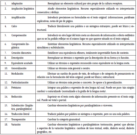 En este enfoque, Molina (2001) pone en consideración la reflexión de Hurtado Albir (1996) para proponer su propia definición de técnica de traducción: "procedimiento de análisis y catalogación del funcionamiento de la equivalencia traductora" (p.115) y les atribuye cinco características básicas 1. Afectan al resultado de la traducción, 2. Se catalogan en comparación con el original, 3. Se refieren a microunidades textuales, 4. Tienen un carácter discursivo y contextual, 5. Son funcionales. Su propuesta se concreta en la clasificación de dieciocho técnicas de traducción con enfoque dinámico y funcional: