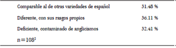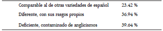 Las próximas preguntas del cuestionario se asocian a actitudes, percepciones y conocimiento de los participantes sobre el español hablado y escrito de los Estados Unidos. La pregunta n.° 5, la cual hace referencia a los fundamentos 1 y 2 de la definición de Holmes (2013)) que se presentó anteriormente, ya que pide a los participantes que comparen el español de los Estrados Unidos con el de otras variedades del mundo hispánico. Los resultados se muestran en la Tabla 2: