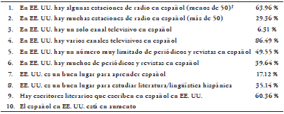 Continuando con las preguntas del cuestionario, la n.° 11 tiene como objetivo determinar el conocimiento que posee el hablante sobre el uso y la difusión del español de los Estados Unidos e incluye una serie de aseveraciones sobre la radio, la televisión, los periódicos y las casas publicadoras. Se les pidió a los participantes que escogieran aquellas aseveraciones que consideraban ciertas. En la Tabla 4 se presentan los resultados: