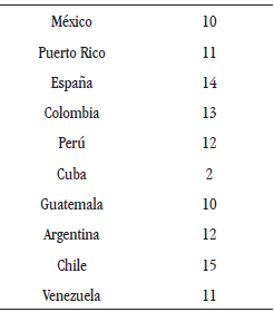 En el estudio se incluyó un total de 110 participantes, todos de clase media o media alta (estudiantes universitarios y profesionales). Se eliminaron los cuestionarios incompletos y aquellos cuestionarios consecutivos (que entraron al sistema casi simultáneamente) que contenían respuestas idénticas. Este tipo de cuestionarios con respuestas idénticas puede ocurrir cuando el usuario oprime el botón de "enviar" más de una vez y como los cuestionarios eran anónimos no había otra manera de identificarlos o distinguirlos, así que se optó por eliminarlos para no sacrificar la integridad del estudio. Se hizo uso de SPSS (incluyendo tabulación cruzada) para el análisis estadístico de los resultados. También se limitó el número máximo de participantes por cada país a 15 para que no hubiera tanta disparidad. En los casos en los que se recibieron más de 15 cuestionarios de un país determinado, simplemente se optó por los primeros 15 que entraron al sistema y que cumplían con los requisitos mínimos. La Tabla 1 muestra el número de participantes por país: