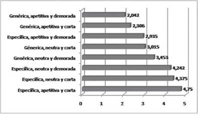 En esta prueba se identificó que las diferencias se dan concretamente entre la condición de retroalimentación específica, apetitiva y corta, con la mayor media de pun tuaciones de diferencia pre-post y la condición de retroalimentación genérica, apetitiva y demorada, con la menor media de puntuaciones de diferencia. Para tener una repre sentación visual de los resultados, se presenta una gráfica de barras de las medias de diferencia de cada condición (Figura 1).