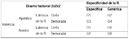En esta investigación se utilizó un diseño factorial, dentro de la categoría de dise ños experimentales, por medio del cual se manipularon y cruzaron dos o más variables independientes que incluyeron dos o más niveles de presencia en cada una de las varia bles (Hernández, Fernández & Baptista, 2010). Con este diseño se manejaron tres varia bles independientes: latencia de la retroalimentación (corta o demorada), especificidad de la retroalimentación (específica o genérica) y valencia de la retroalimentación ante el error (neutra o apetitiva) (ver Tabla 1).