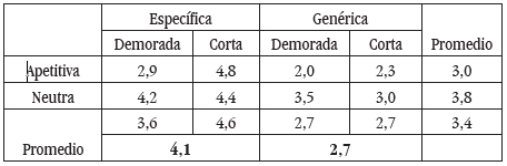 Con el propósito de revisar la posibilidad de un efecto de interacción entre las variables se presenta la Tabla 2, en la que se exponen las medias de cada condición y se muestran también unos promedios generales por componentes de la condición.