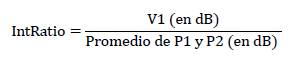 Una vez tomadas las medidas, se dividió el valor de V (en decibelios) entre el promedio de P1 y P2 (también en decibelios) siguiendo la siguiente fórmula: