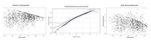 El panel central de la Figura 3 representa un gráfico de distribución normal. Este tipo de gráficos proporciona una estimación sobre dónde se encuentran los cuantiles muestrales con respecto a los cuantiles teóricos. Una fuerte desviación de la línea proporcionada indicaría que los residuos no están distribuidos de manera normal. En este gráfico en particular se puede observar alguna desviación de la línea normal esperada hacia las colas, pero en general la línea parece recta.