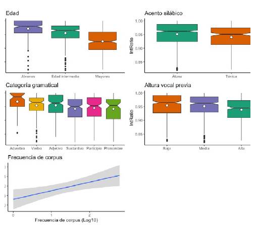 El análisis de regresión lineal de modelo mixto reveló un efecto significativo de cinco variables: la edad, el acento silábico, la categoría gramatical y la frecuencia de corpus. La Figura 4 ilustra de forma gráfica el efecto de las variables significativas con respecto al IntRatio. Los coeficientes específicos del análisis de regresión aparecen en el Apéndice A.