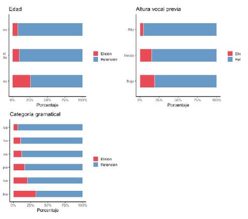 En cuanto a las variables lingüísticas se encontró que hay más casos de elisión cuando la vocal anterior es baja, mientras que hubo mayor retención cuando la vocal previa era una vocal alta. Finalmente, se hallaron diferentes tasas de elisión al comparar diferentes categorías gramaticales. En este caso, los adverbios mostraron una mayor tasa de elisión, seguidos de los adjetivos y los participios. Por el contrario, los sustantivos constituyen la categoría gramatical con la menor tasa de elisión.