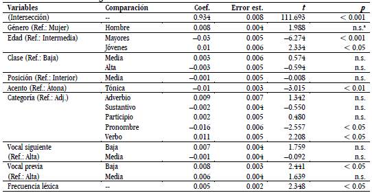 En resumen, tanto el análisis categórico como el continuo sugieren que el debilitamiento de /d/ intervocálica está condicionado por factores tanto lingüísticos como extralingüísticos. Aunque se observaron algunas semejanzas en los resultados de estos análisis, también se encontraron algunas diferencias al comparar los resultados de ambos análisis. En la siguiente sección se ofrece una discusión de estos resultados y sus implicaciones para los análisis sociofonéticos.