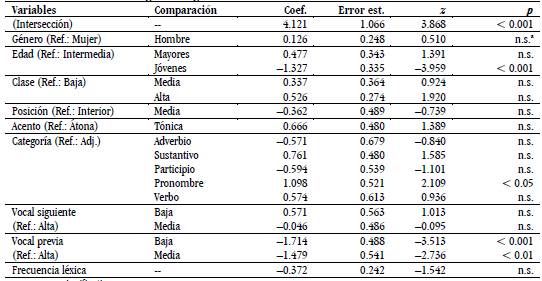 Con respecto al análisis categórico, se llevó a cabo un análisis de regresión logística de modelo mixto usando el paquete lme4 (Bates et al., 2015). La variable dependiente fue la realización binaria de /d/ (i.e., retención o elisión). En este análisis se incluyeron los mismos efectos fijos y aleatorios que en el análisis continuo. También se llevó a cabo una revisión de las variables independientes y se confirmó que no había multicolinealidad en este modelo.