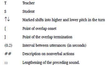 In order to analyze the dynamic of talk-in-interaction with its variations, a 20-minutes English class was video-recorded as a data gathering technique; from that video, almost 3 minutes were transcribed, and 5 extracts were analyzed, being these extracts, the instrument used for analyzing the data gathered through the transcription system adapted from Van Lier (1988b) and Johnson (1995):