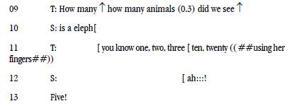 So, to repair what the student was about to say, in turn 11, it is seen that the teacher identified the problem and decided to repair it, producing here a repair type: other initiated/other repaired (turns 10 and 11). Also, it can be seen in this turn that the teacher uses extra help, and adopts an affiliative repairable form by means of a strategy she considers will help the student to understand better the question asked by using her fingers and counting ( [you know one, two, three [ ten, twenty (( ##using her fingers##))). In turn 12, the strategy used by the teacher in the previous turn worked well because of the overlapping made by the student ([ ah:::! ), pleasing the teacher and letting her know that she knows now the answer; so in turn 13, it is seen how student right away gives the right answer (Five! ), producing here another type of repair which is other initiated/self-repaired; right here it can be seen how the dynamics of social action works since the turns are complementing each other showing us what occurs in the previous talk that complements the next one producing a successful interaction.