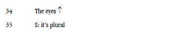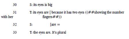 In turn 30, it is evident a trouble source (its eyes is big) and it is identified by the teacher (turn 31). It is noticed that the student does not realize what the problem is, which is a situation that leads the teacher in turn 31 to initiate a repair (its eyes are), producing here a type of repair (other initiated/other repaired) and in addition to this, she gives an extra explanation (because it has two eyes) in order to make the student understand the main purpose of her explanation which is to correct the mistake the student was making. Besides, it could be said here there is a first position repair because the source of the problem in turn 30 was repaired in the next turn (turn 31). Moreover, from the transcription of the extract, in turn 31, the role of the gestures made by the teacher, when she reinforces her explanation by showing the number with her fingers, confirm the repair once again. This last aspect in particular gave a hint of the kind of teacher she is because she uses her pedagogical resources to make herself understood. This can be considered as part of her identity as a teacher because it could be inferred by this, she is the kind of teacher that helps, explains, reinforces the topic. Then, in turn 32, it is seen how the repair of the teacher had a big effect on the student in terms of social actions since in this turn the student incorporates what was repaired ( [are = ). Also, in this turn it is noticed that the student identifies and assimilates the mistake, and although the teacher does not point out specifically the word "are" to repair the mistake, the student does identify the source of the problem and incorporates the repair in her turn (32). On the other hand, in terms of identity, it is relevant to highlight that the student knows that the teacher is the one who knows the topic, and if teacher repairs something while interacting is because the teacher is correct, so the student in this turn recognizes the role of the teacher, that is the reason why she affiliates with the teacher's repair. In turn 33, it can be observed that the teacher keeps incorporating the repair as a pedagogical strategy to clarify doubts (the eyes are. It's plural), but without being pleased with this situation, in turn 34 it is identified a clarification request made by the teacher (the eyes are ↑ ). It is noticed a sequence of the repair that is repeated because despite the fact the problem was tackled in the previous turns, the teacher keeps incorporating the repair, that is called extended repair or reconfiguration of repair because the teacher not completely satisfied to have pointed out the mistake, explained it or made the student incorporate the repair in her interaction, she keeps insisting with it. Finally, in turn 35, it is observed that there is so much ascription in terms of identity that it is no longer enough to know that the problem was "are", but now the student also assimilates all the teacher's pedagogical movements because the situation went from being "are" explained, understood and incorporated, but now the student wants to reaffirm the extra information given by the teacher (it'splural), showing us now all the rebound effect that the repair has in language interaction. To summarize, it can be seen how repair is the way the participants manage their communication issues.