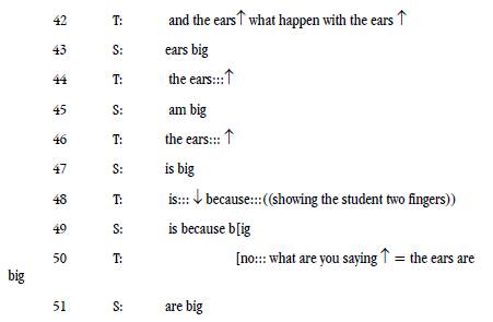 In turn 42, there is an intervention of the teacher asking for specific information using a referential question since she wants the student to give longer information to describe what they are talking (and the ears↑ what happen with the ears ↑), as it is seen, the second part of the question formulated in turn 42, more than providing information to the student, this element wants to reassert a pedagogical concept; since the first part of the question is already clear and understandable, what the teachers really wants with the second part is to try to help the student focalize what she needs to achieve. This second element is so effective that it evidently manages to channel the student's response, as seen in turn 43 (ears big). This second element has a pedagogical purpose that the teacher imposes before having an interactive purpose or establishing communication; this occurs particularly in the classroom and goes hand in hand with learning the language. Because although the teacher first tries to obtain longer information as it is seen in turn 42, she fails, due to the student's response (43). But what the teacher does is to give information in such a way that it helps the student to respond to what she wants to hear, since she is the authority; and this attempt is so successful, that it occurs repetitively in the classroom because beyond having communication, there are pedagogical intentions different from what is elicited in interaction and communication. All of this is an interactive movement that the teacher gives to help the student grasp what she wants. At the end, there is an answer from the student, an answer that although is grammatically misplaced, is a suitable answer for the question in terms of interaction and communication. In turn 43, even though the student answered the question, it is seen that the student answers the question with a word order mistake (ears big); due to this, the teacher in turn 44, not being completely pleased with the student's answer, decides to reorganize the question with the intention of letting the student know that is making a mistake and must correct it (the ears::: ↑). In turn 45, the student understands the teacher's desire and continues giving an answer that she thinks is correct (am big), but once again she fails, to which in turn 46, the teacher uses the same question with a higher intonation (the ears::::: ↑), trying this time to give feedback with this question, letting the student know once again that she is making a mistake, even if it is a different mistake; there is a great effort from the teacher for repairing what is wrong, that is the reason why she uses different strategies such as re-stating the questions or using different voice intonation, producing here a repair type named other-initiated/ other-repaired. It is also seen that from the first time the teacher reorganized the question in turn 44 and then in turn 46, there is not extra information in the way the teacher asks the questions (the ears::: ↑), thus, this could be one of the reasons the student gives a wrong answer since she does not realize which one is the mistake and what the teacher wants her to correct.