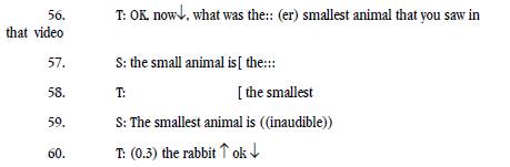 In turn 57, it is seen that the student understands the question and knows what the teacher wants, because she incorporates the words used previously by her teacher, to form a long answer in the answer she is giving. However, in doing so, she makes a mistake (the small animal is[ the:::). The teacher then, in turn 58 interrupts her student which is disaffiliate, and proceeds to immediately repair the mistake, being worried once more for grammar mistakes, instead of seeing the progress that the student is making in terms of interaction. The student knows once again that her teacher is correcting her, so she accepts the repair and incorporates it successfully in the next turn (59). In turn 60, the teacher gives feedback to the student by repeating the answer given in the previous turn ((0.3) the rabbit ↑ ok↓), letting the student know somehow with this repetition, that she was correct. Then, the teacher concludes the turn by saying "ok" and tells her student that it is time to continue with the conversation.