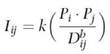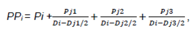 donde PPi es el potencial de población del lugar de origen. Pi y Pj indican la población total del punto de origen y punto de destino respectivamente. Di es el punto que marca el punto inicial de la distancia y Dj el punto de destino. La división en dos representa el punto intermedio de la interacción entre el lugar de origen y de destino.