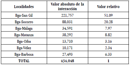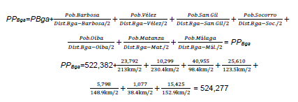 Teniendo en cuenta lo anterior, identifiquemos ahora el centro con mayor potencial de población a partir de la aplicación de la ecuación de modelos de gravedad a cada una de las capitales de provincia y otras localidades de relevancia funcional, (ion el fin de determinar el PO do Bucaramanga ( [Boa], en lo que sigue) utilizamos la Fórmula 2, una extensión de la ecuación de gravedad utilizada en geolingüística (Hernández Campoy, 1998, 2002, 2012).