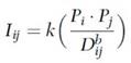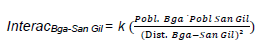 donde Iij indica el volumen de interacción espacial estimado entre el lugar de origen i y el lugar de destino j. k es la constante que varía dependiendo del conjunto de datos específicos. D representa la distancia entre iyj. b señala la distancia exponencial que igualmente varía dependiendo del conjunto de datos específicos. Pi y Pj indican la población total del punto de origen y del punto de destino respectivamente (Wheeler, 2005).