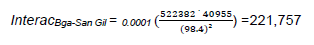 Con la ecuación, cuantifiquemos ahora la probabilidad de contacto cara a cara entre las comunidades bumanguesas y sangileñas para así calcular el potencial de transmisión lingüística entre estas comunidades. Utilizaremos tos datos demográficos según DANE d2010d y la distancia que senara a los dos centros urbanos. La ecuación se aplica a la interacción de Bucaramanga con cada una de las localidades dentro de la zona dialectal Veamos la ecuación para calcular la interacción Bucaramanga-San Gil: