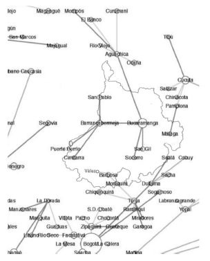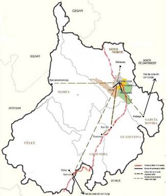 El mapa ilustra la red de conexión urbano rural entre las mayores localidades del departamento. Bucaramanga aparece con conexiones más cercanas a San Gil y Socorro, en el centro del departamento, y con Barrancabermeja, ubicada en tierras bajas en el oeste. A causa del impacto de la distancia y demografía urbana, no aparece una red de conectividad con la provincia de Vélez en el sur del departamento ni con la provincia de García Rovira en el oeste. Málaga, capital de esta provincia, se muestra con conexiones próximas a Cúcuta (el mayor centro urbano de la región subdialectal de Norte de Santander). Por su parte, en la provincia veleña, Barbosa tiene enlaces más próximos con localidades fuera de su zona dialectal, como es el caso de su conexión con Tunja (Vélez no aparece en el mapa y, por consiguiente, sin conexión terrestre destacable con un centro funcional mayor).