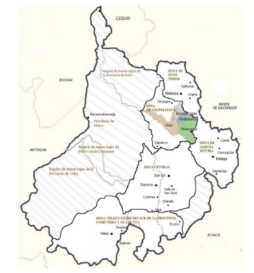 El español hablado en la zona identificada para el subdialecto santandereano sur está conformado por dos variedades: una hablada en tierras bajas a lo largo de la cuenca del río Magdalena (en el oeste del departamento) y otra en tierras altas del último tramo andino oriental. Para propósitos de planificación, zonificación y administración, el departamento está dividido en siete provincias administrativas: Guanentá, Comunera, Vélez, García Rovira, Mares, junto con Soto Norte y provincia Metropolitana que, según ordenanza, adhiere municipios que hacían parte de otras provincias (Gobernación de Santander, 2019). El 75.6 % de la población departamental se encuentra aglutinada principalmente en la provincia Metropolitana y en el puerto petrolero de Barrancabermeja (capital de la provincia intermedia de Mares). El 24.4 % de la población santandereana habita el área rural (Gobernación de Santander & Universidad Santo Tomás de Aquino, 2014). Como capital del departamento, Bucaramanga constituye el centro administrativo, de infraestructura y desarrollo de la región, y junto con las localidades vecinas de Girón, Floridablanca y Piedecuesta, conforma el Área Metropolitana de Bucaramanga (AMB), un conglomerado que concentra 1 169 484 habitantes en sus cabeceras municipales (datos de 2018, Departamento Administrativo Nacional de Estadísticas [DANE], 2010). La jerarquía y centralidad de Bucaramanga y su área metropolitana se presume dado su papel administrativo, político y fiscal, pero principalmente en consideración a su densidad poblacional. Esto le permite tener un área de influencia de mayor peso en la región y un posicionamiento que la ubicaría en el rango más alto de jerarquía en la región.