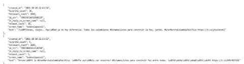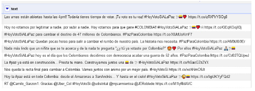 En la exploración y el procesamiento de los datos capturados es posible encontrar de forma automática, por ejemplo, el tuit más retuiteado, el que más likes tuvo y de esa forma empezar a visualizar tópicos recurrentes y ausencias en los datos, elementos que más adelante pueden ser importantes en el análisis discursivo. Los datos obtenidos cuentan con la siguiente información: fecha de creación, número de favoritos (o likes), de seguidores, de identificación, de comentarios, de retuits, el nombre de perfil, el texto como tal y un hipervínculo si contiene algún material multimedia: imágenes o videos principalmente. A través de otra librería de Python es posible organizar los datos en tablas. No obstante, debido al gran número de datos y a que, en algunos casos, los tuits quedan cortados y con caracteres de símbolos, lo cual hace que no se puedan observar de forma integral y así se dificulta la decodificación, es necesario optar por otras herramientas de visualización, como se verá en el apartado 4.