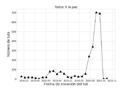 Usando Python también es posible seguir la evolución del número de tuits durante el periodo de tiempo elegido. Así, se pueden diseñar gráficos como el del ejemplo de la Figura 2, en el cual se observa en el eje vertical el número de tuits publicados y en el eje horizontal el mes en el que fueron producidos. En este ejemplo se advierte con claridad el aumento en la producción de tuits en el segundo trimestre (desde mayo hasta julio de 2016) y luego el crecimiento exponencial en el tercer trimestre (desde agosto hasta octubre de 2016).