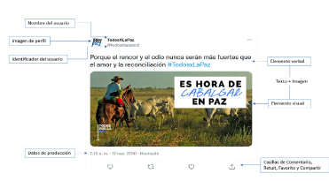 En segunda instancia, debido a la naturaleza del corpus: tuits sobre un asunto público de carácter político-social, se considera importante codificarlo a partir de categorías que den cuenta de la interacción multimodal, para lo cual se utiliza la propuesta de Roque (2016, 2017). Si bien los planteamientos del autor han sido expuestos para analizar imágenes como afiches sobre la guerra o anuncios publicitarios por la evidente intención argumentativa, se tiene en cuenta que también se pueden emplear para los tuits, porque en la mayoría de los casos se presenta una interferencia entre los modos de composición. Específicamente, resulta relevante establecer una codificación balanceada de la interacción entre el encuadre verbal y el elemento visual que conforma el tuit, con el fin de comprender su funcionamiento.