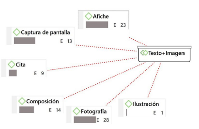 En primera instancia, los tuits se pueden clasificar en cuatro categorías generales siguiendo el modelo propuesto por Gallardo-Paúls et al. (2018) de acuerdo con la estructura semiótica: texto, texto con imagen fija, texto con imagen en movimiento y texto con enlace. A su vez, dentro de la categoría "imagen fija" se utiliza la caracterización sobre el formato de Marchal et al. (2021): fotografía, que incluye las selfies, las que el usuario toma a otros; ilustración, que incorpora dibujos o caricaturas; captura de pantalla, que puede ser a la pantalla del computador o del celular, por ejemplo, de noticias o publicaciones de otras redes sociales; infografía, que consiste en la representación visual de datos, se incluyen también estadísticas, mapas o gráficas con resultados de encuestas; composición, que es una mezcla de varias categorías, por ejemplo, un collage o serie de fotos, también un meme o un video y un cartel a la vez, y afiche, que supone carteles promocionales, folletos y volantes. En la Figura 5 se observan algunos ejemplos de estas categorías y en la Figura 6 se aprecia una visualización básica en un documento de Atlas.ti. En cuanto a las imágenes en movimiento, se puede atender a categorías emergentes halladas en el corpus, tales como videos testimoniales, spots o animaciones. Sobre el texto con enlace, en algunos casos puede que se encuentre el vínculo embebido y aparezca la fotografía del portal web enlazado; en otros casos, solo se presenta la URL. Esta codificación inductiva inicial permite examinar la constitución general del corpus y reconocer las temáticas más recurrentes y los formatos en que esta se presenta.