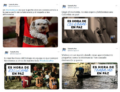 Se trata entonces de distinguir cuatro tipos de interferencias verbo-icónicas, como podemos observar en los ejemplos de la Figura 7: 1) la bandera visual, visual flag (Birdsell & Groarke 2007), cuando la imagen atrae la atención hacia un argumento que se presenta verbalmente, estrategia muy utilizada en los tuits que tienen la imagen como enganche para atraer la atención de los usuarios; 2) el paralelismo, cuando tanto la imagen como el texto presentan la misma idea y se podría decir que es redundante, por ejemplo, un tuit descriptivo de una acción que se encuentra exactamente en la imagen; 3) la complementariedad o argumento conjunto, cuando los dos enunciados se complementan, aportando cada uno información importante para el sentido general del enunciado, como el caso del enunciado verbal de un tuit que indica ver lo que se encuentra en la imagen; 4) el antagonismo, cuando los dos enunciados presentan una relación opuesta, es decir, mientras el enunciado visual muestra una situación, el enunciado verbal lo niega, tal es el caso de un tuit en el que, por ejemplo, se pide que cese la violencia y la imagen es justamente una escena violenta.