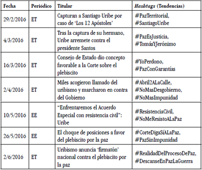 De este modo, con los registros de información de los periódicos digitales y los trending topics, se puede elaborar un chequeo cruzado que permite relacionar los acontecimientos que fueron noticia en la prensa escrita digital con las tendencias de Twitter. Con este procedimiento se pueden observar las hipermediaciones (Scolari, 2008), es decir, procesos de intercambio, producción y consumo simbólico desarrollado en la red. En efecto, con la revisión cruzada de los datos de las dos fuentes mencionadas se observa si aquello que fue tendencia en la red social tuvo alguna repercusión en la prensa o si, en sentido opuesto, alguna noticia fue viralizada en Twitter. En la Tabla 1 se puede ver una muestra de este procedimiento retomado de la investigación en curso5. Este registro cruzado de ambas fuentes además posibilita la generación de esquemas o diagramas que sinteticen la información para que pueda ser visualizada de una mejor forma. Por ejemplo, cuando se trata de algún acontecimiento durante un periodo de tiempo, es posible elaborar una línea de tiempo que organice la secuencia de hechos junto con los hashtags y, de esa forma, se pueda ver su evolución.