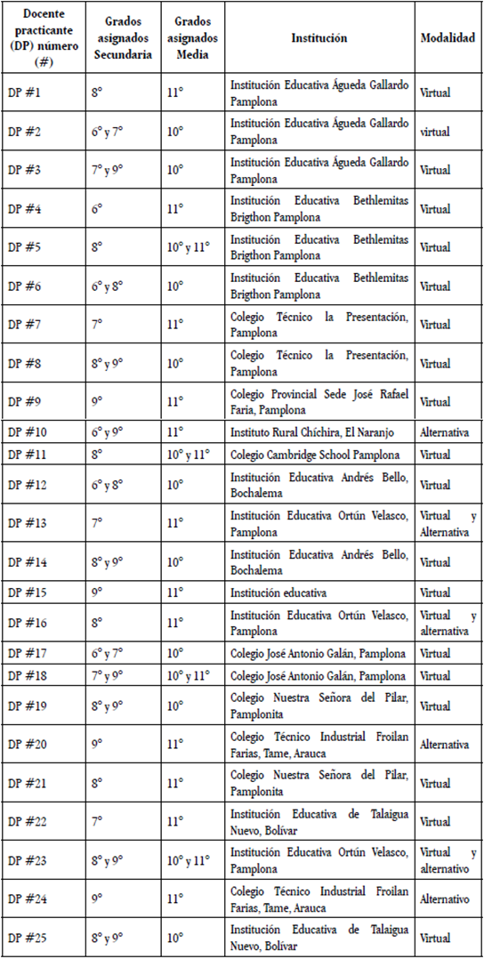 Los participantes en este estudio fueron 25 docentes en formación, quienes realizaron sus prácticas con estudiantes de educación secundaria y media de instituciones públicas. Los docentes tuvieron a cargo entre dos y tres niveles a partir de la distribución en los órdenes local, regional y nacional; el escenario o modalidad fue dado por las mismas directrices de cada colegio. A continuación, se amplía la información en la Tabla 1.